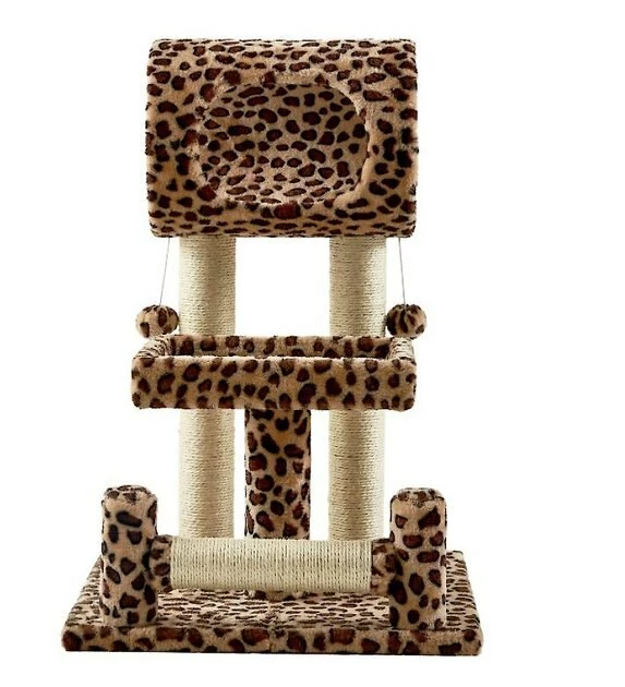 This all-in-one cat tree is recommended for kittens and small cats to enjoy. With the animal print Frisco 28-Inch Cat Tree, your kitty can answer the call of the wild—even when she’s indoors. This cat tree has everything your cat needs to play, hunt, jump and sleep in one compact tree that she can claim as her own. It comes with two vertical posts that are covered in natural sisal rope—perfect for sinking her claws into. There’s also a horizontal post that spins around as your kitty scratches the sisal covering. These special scratching areas help satisfy her natural urge to scratch instead of using your furniture. When it’s time to “hunt,” your frisky kitty can jump onto the middle perch and bat around the fuzzy hanging pom-poms. After playtime, your cat can crawl inside the tube-shaped hideout at the top of her tree for a long nap. The widened, oval opening lets her easily climb through from the middle perch to this cozy, private sleeping spot. The base and perches are covered in a soft material with a fun animal print pattern.