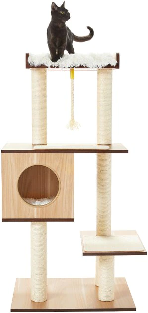 Is your kitty in the market for some prime purring real estate? This 47.5-in, four-story, high-rise cat tree is move-in ready and comes with all the amenities for kitties. There are five scratching posts fully wrapped in sisal rope, and two sisal scratching pads. Sisal feels like tree bark to cats—a feline’s favorite scratching surface out in nature. The kitty-approved design provides plenty of vertical climbing space up to a penthouse perch on the top floor, and a cozy condo for when your cat needs a private retreat, with its own eyelash “fur” cushion to level up the cozy. Crafted with a contemporary feel in stylish white or grey wood grain, this is one cat tree you’ll want to show off.