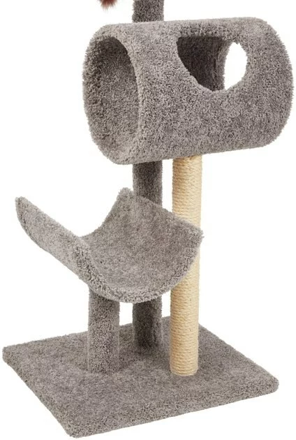Invite your kitty to this tunnel of relaxation! This cat tree features three levels for the ultimate lounge, play and nap session, including a roomy tunnel to turn up the lounge time fun. The tall sisal scratching post encourages your kitty to get their stretching and scratching on whenever they please, plus the toy under the top perch provides extra playtime excitement. It’s handcrafted in the USA with globally sourced materials. This cat tree is hand-built with solid wood posts and wrapped in a thick, household carpet for a rich, plush texture cats can’t get enough of. Plus, with the easy two-step assembly, your cat can get to lounging quickly.