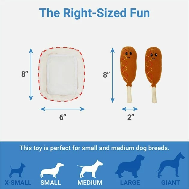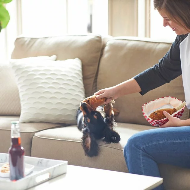 Send them on the field with a fun snack! This 3-in-1 toy will bring interactive furry fun to your pupโs baseball game. It features a plush basket and two detachable plush corn dogs thatโll engage your sporty canine at playtime. The built-in squeaker keeps this play session exciting all season long!