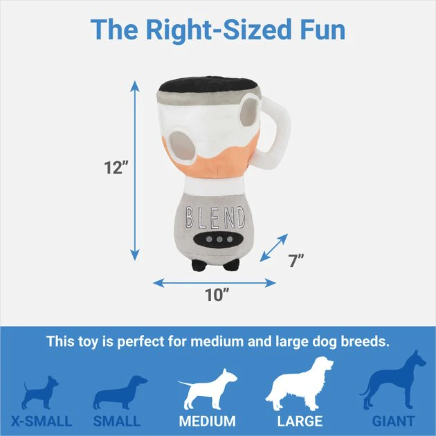 - Blender puzzle toy comes with a blender base along with four deliciously squeaky fruit toys to find.