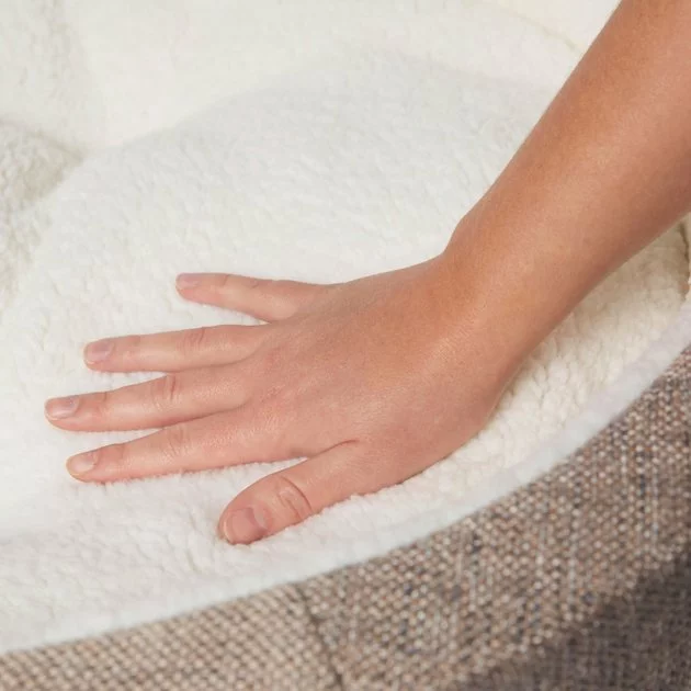 - Available in a brown faux linen or gray chenille fabric with a plush, sherpa sleep surface.