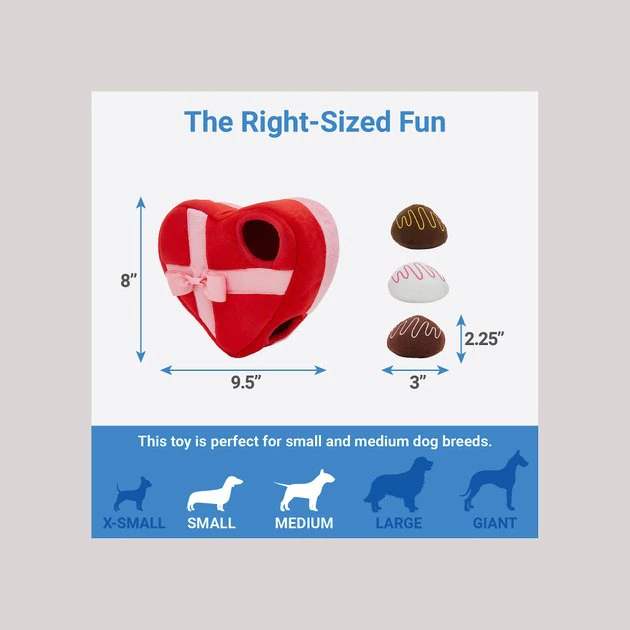 Playtime really can be a box of chocolates! This Valentine’s box of chocolates puzzle toy features a heart-shaped box toy and three individual chocolates for your dog to dig out of the box. Each piece of chocolate has a fun squeaker inside to entice your dog to solve the puzzle, so they’ll keep exercising their mind, keep their brain active and help beat doggie boredom.