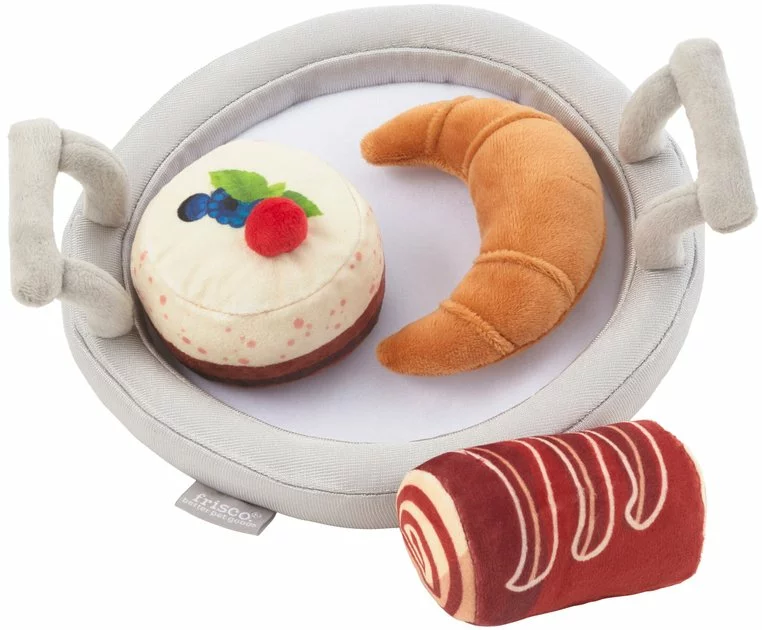 - Brunch pastry tray toys include sewn-in squeakers and crinkle paper in each pastry that’s sure to make your dog’s tail wag with joy.