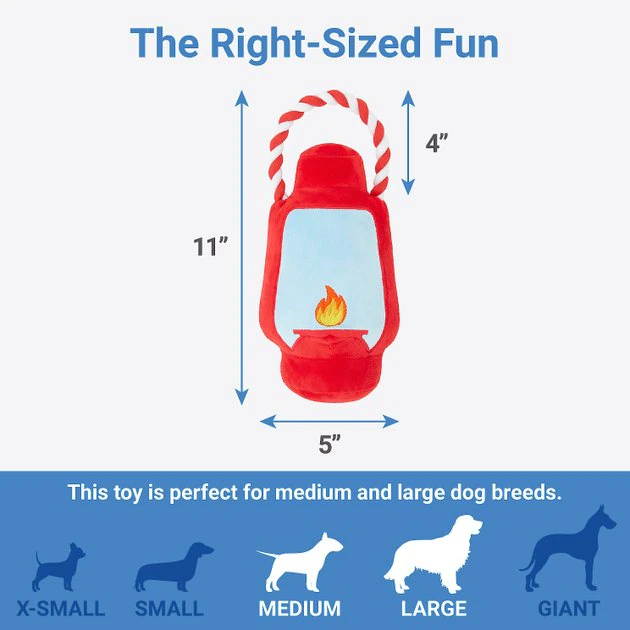 - Camping lantern plush toy has squeakers and rope to turn up the fun.