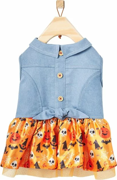 Outfit your dog or cat for the spooky celebrations this year with the Frisco Chambray Halloween Dog & Cat Dress! Somewhere between a full costume and skipping dress up, this dress is perfect for Halloween parties, photo ops and trick-or-treat trips. It goes on easily and helps keep them comfy with less fuss, thanks to the hook-and-loop fasteners all the way up the belly. It features a chambray top and classic Halloween-patterned skirt with glittery tulle underneath. Whatever frighteningly fun things you get up to with your furry friend this Halloween, this dress is perfect for the party.