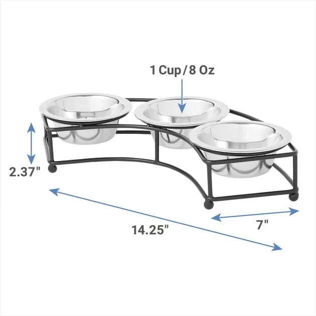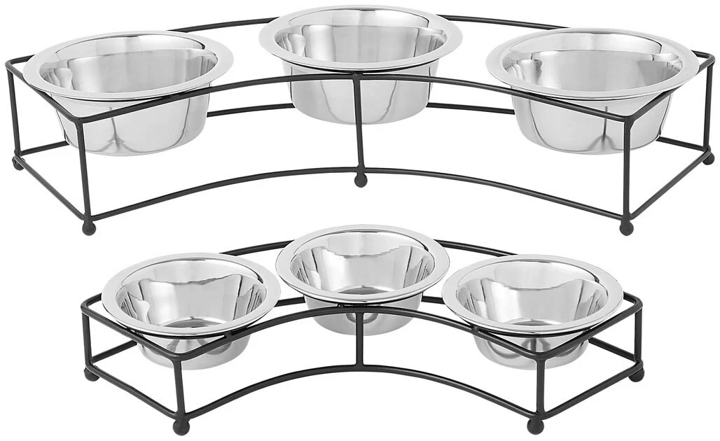 elevates dinnertime for your dog or kitty and gives you three feeding options in one. The durable iron stand keeps bowls where pets want them, and the curved design makes it ideal for that rounded corner in your home. Hand wash the removable stainless-steel bowls or throw them in the dishwasher for easy cleaning.