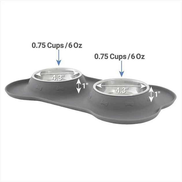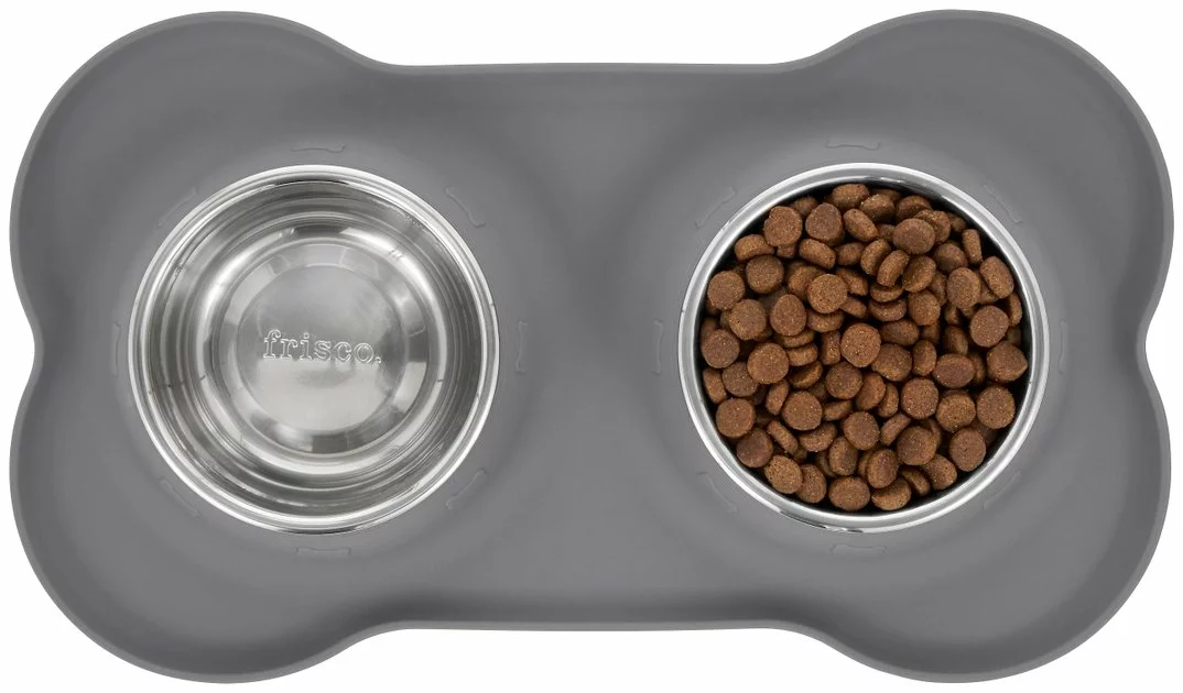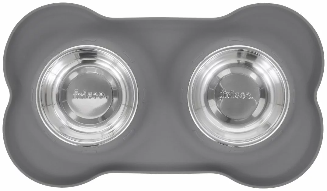 Tip your hat to the virtually untippable Friscoโs Double Stainless Steel Pet Bowl with Silicone Mat. Designed to help prevent tipping over, these two removable stainless-steel bowls fit firmly into secure slots inside the silicone mat, which helps prevent spills too. Plus, itโs top-rack dishwasher safe!