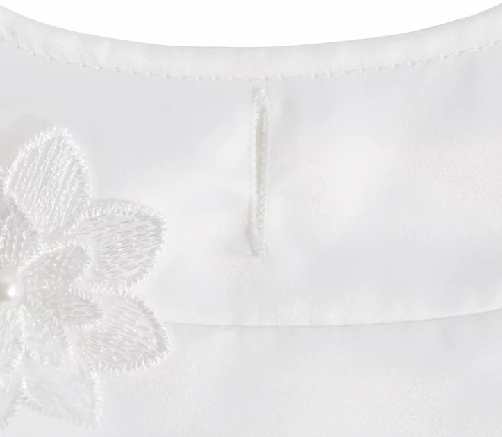 - Lovely lace floral embellishments with faux pearl beading, layered tulle skirt, and satin bow add a touch of elegance.