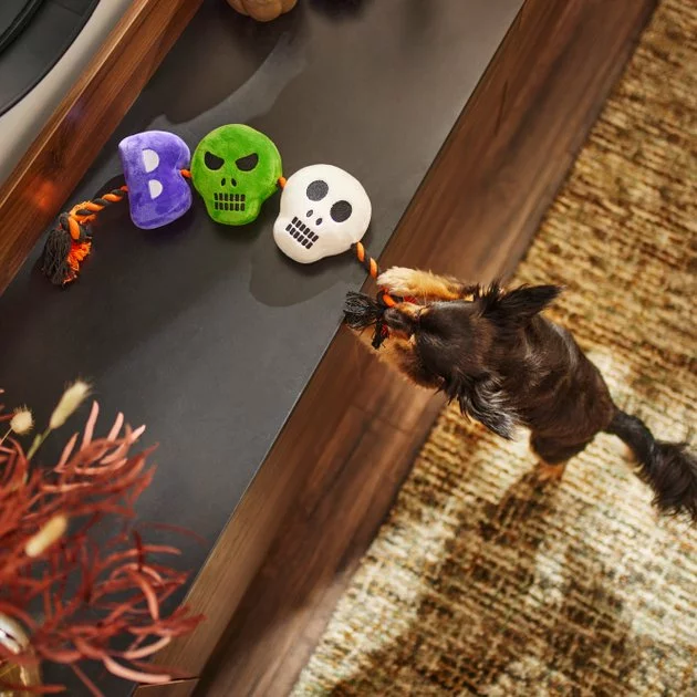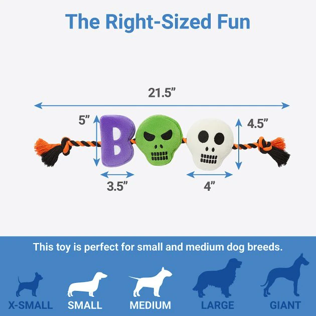 Your boo is gonna love this classic combo, fur sure! This toy combines two pup favorites: plush toys they can easily catch and carry, and a rope toy that they can really chomp down on. There are three plushies that spell out “BOO,” with two skulls for O’s, and each one has a squeaker inside to make their ears perk up over and over again! Running through the middle, there’s a Halloween-colored, poly-cotton blend rope. Squeak it, toss it, catch it, fetch it—however your dog loves to play their interactive games, this toy is made for spooktacular Halloween-themed fun.