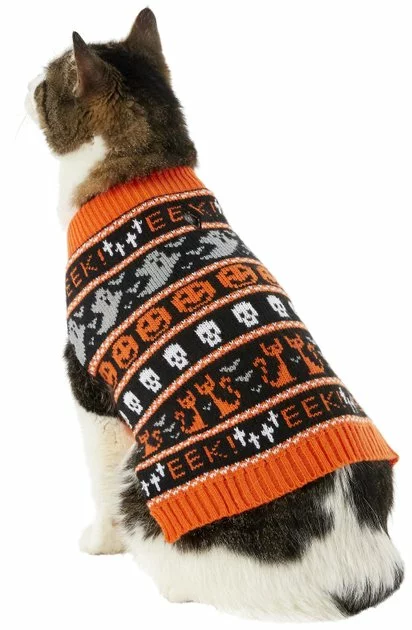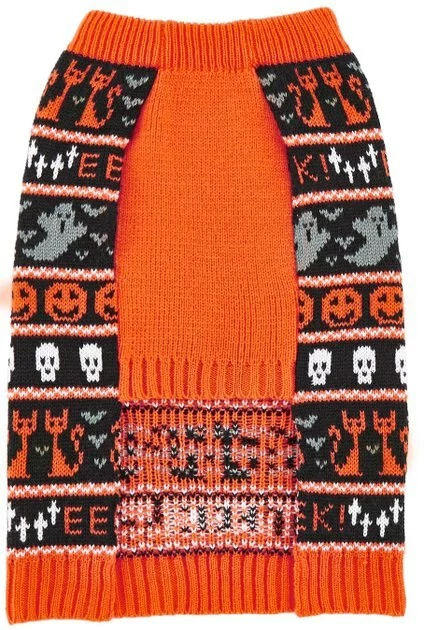 Remember to measure your pet for the paw-fect fit. Dapper meets spooky with this adorable Halloweenified Fair Isle print sweater. Perfect for cats and dogs alike, throw it on to impress all the trick-or-treaters. It comes in many sizes so you can find the perfect fit for your furry one. The neckline has elastic cinching so it fits snugly. Plus, the built-in leash hole lets you leash up and go whenever your pet needs a walk.