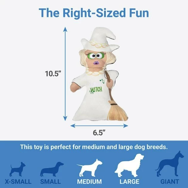 Good witch or bad witch? Every mischievous furry friend has a little bit of both in them, and so does this toy! It’s soft, plushy and squeaky, so it’s great for all kinds of play and cuddling too. But this witch is also reversible. On one side, the witch is dressed in all white like the Good Witch. On the other, she’s dressed in all black with classic green skin. These witches are brewing up some serious fun for pups this Halloween, so don’t miss out!