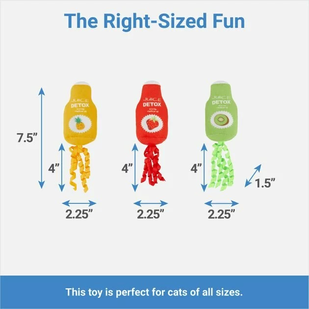 - Juice cleanse plush cat toys include catnip and crinkle paper to amp up playtime and get kitty moving.