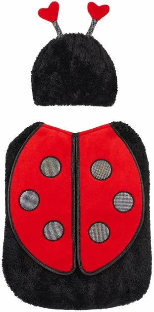 - Separate ladybug head hat has two heart antennae and a hook-and-loop chin strap.