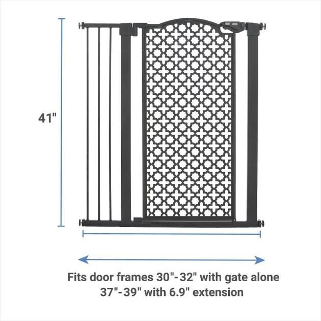 Check out the Size tab to be sure this gate fits your doorway. Turn any room in your home into an extra-tall-pet safe zone with the Frisco Metal Pattern Extra Tall Auto-Close Pet Gate. With its durable, metal construction, this gate is designed to keep your pet—especially your large or giant breed dog—safely contained; and with its cool, geometric pattern, it’s sure to make a stylish addition to your home. Simply install it in a door frame or hallway to provide your pet with a place all their own. The pressure mount system makes setting it up and taking it down easy, so you can move it to different areas of the house as needed. The gate door works double duty by staying open when you need it to—just open it past 90 degrees to lock it open—or otherwise closing on its own. You can also set up the door to open on either side. The dual-lock safety release means your pal can’t get crafty and open the door, adding a layer of security. Plus, this gate is lightweight so you can transport it and store it easily.
