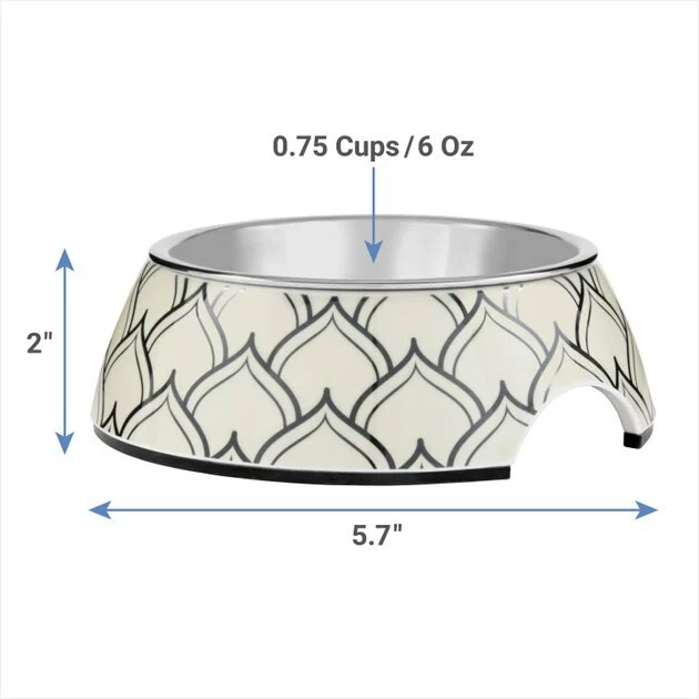 - Melamine base features a Moroccan print that elevates your dog’s dining experience.