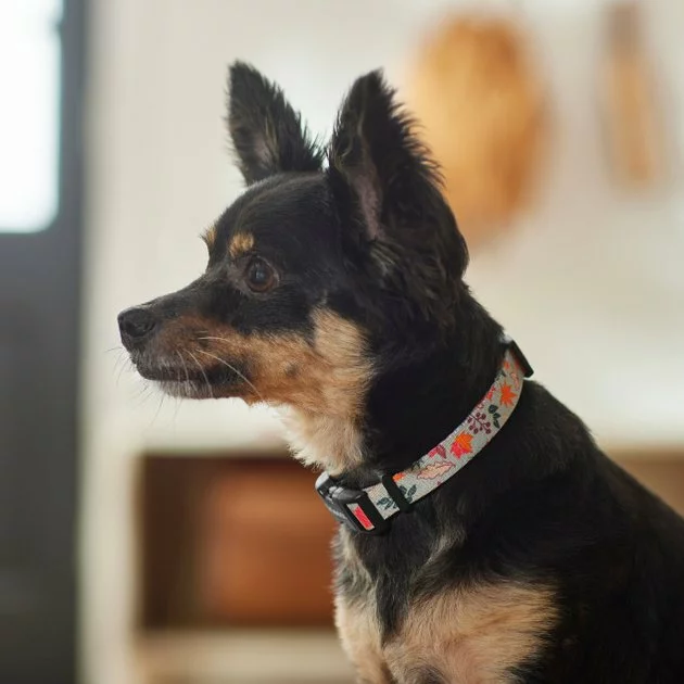 Remember to measure your pet for the paw-fect fit! Designed for everyday wear, this collar combines comfort, security and style. With its fall-themed design, featuring seasonal foliage in classic autumn colors, it’s perfect for every furry fall fashionista. It’s made with durable, high-quality polyester with an Ultra-Weld™ seal, strength tested to withstand up to seven times the maximum recommended weight for each size. This collar also features a plastic buckle with rounded edges for comfort, a nickel-coated D-ring where you can attach a leash, and a separate ID-tag ring too. Plus, it comes in four sizes, and each has an adjustable slide so you can get the best fit for most dogs, even growing puppies. Grab a matching leash to complete the whole fall-themed look!