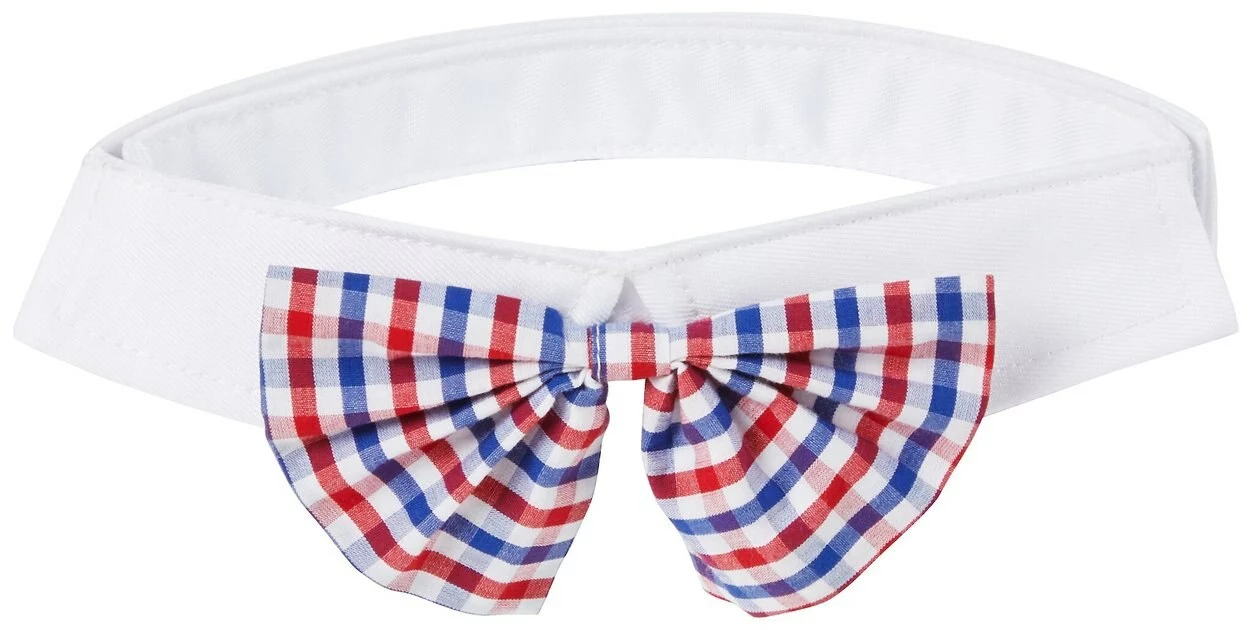 Get your pup or kitty ready to make a fashion statement with the Frisco Plaid Dog & Cat Bow Tie. It goes on with a hook-and-loop fastener around your pal’s neck for that polished look, plus the red and blue plaid pattern gives your pet adorable dapper vibes. The white collar makes it look so realistic, too. It also comes in two sizes with a wide fastener so you can adjust it for the right fit.