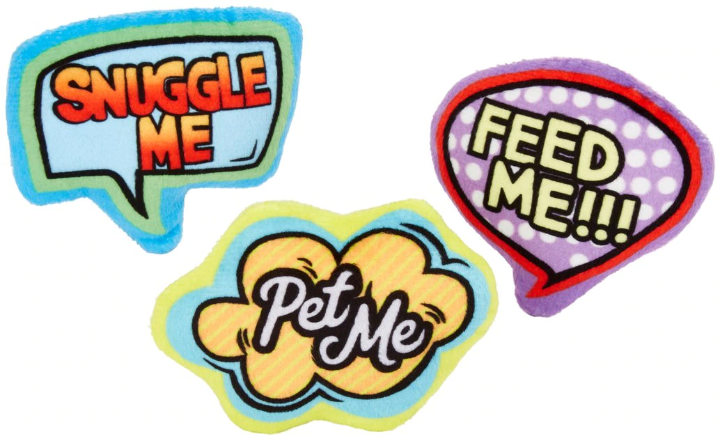 Bang! Whoosh! These comic book bubble cat toys send your cat zooming into a frenzy of retro fun like no other toy can. This three-pack of comic-themed toys each has a plush, clawable fabric cover with enticing, exciting catnip stuffed inside that will drive your cat wild during playtime. Add some retro, flashback flair to your furball’s toy collection with these toys from Frisco!
