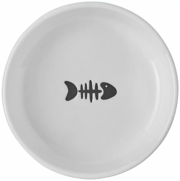 - Round, white ceramic pet bowl with a cute “meow” graphic on the side.