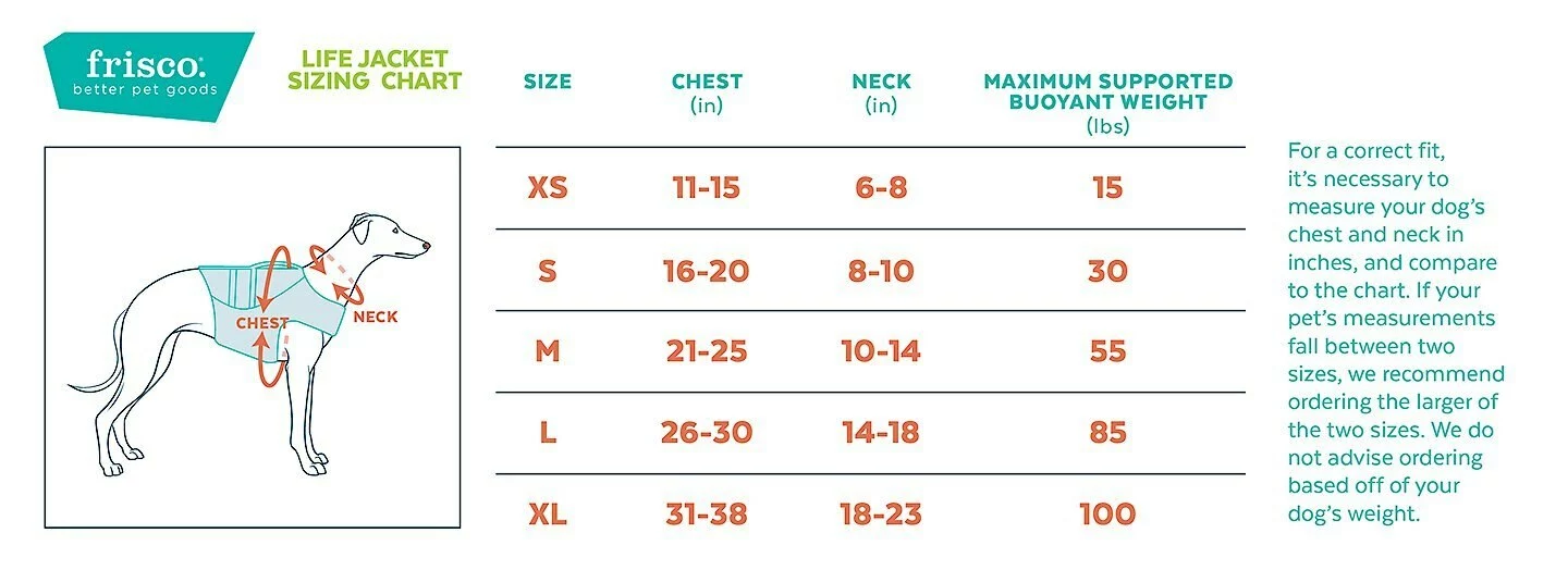 To find the right jacket for your pup, measure their chest, neck and weight. Then, compare their measurements to the size chart and the Maximum Buoyant Weight listed. To measure the chest girth you’ll measure at the broadest part of the chest behind the front legs and to measure for the neck girth you’ll measure at the broadest part of the neck. For the best fit, we recommend selecting the size based on your pet’s chest measurement. Once you have determined the correct size, you should then reference the weight the life jacket can safely support.