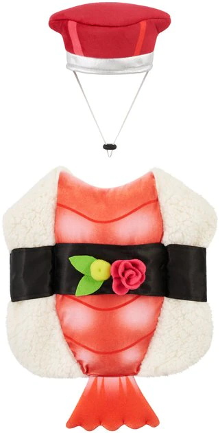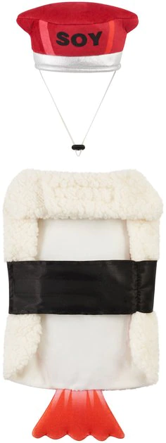 This Halloween, your pet will look like a snack in the Frisco Sushi Dog & Cat Costume! This two-piece costume includes a sushi body with white sherpa fabric and wasabi and flower accents, so it looks like the real deal. With hook-and-loop fasteners at the neck and belly, it fits comfortably and goes on easily, so thereโs less fuss when itโs time to dress up. The separate soy sauce hat is not only adorable, itโs comfy, too, with adjustable elastic ear and chin straps. Head out for a party, trot around the neighborhood for tricks or treats, or stay home for a furry photo op in this costume and make Halloween a hit!