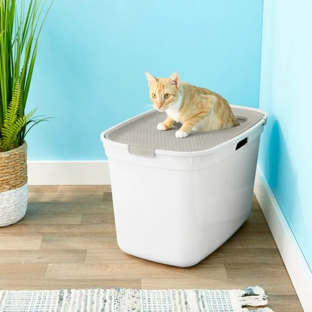 - Top-entry cat litter box features wide opening at top for cats to enter, while helping to keep dogs out.