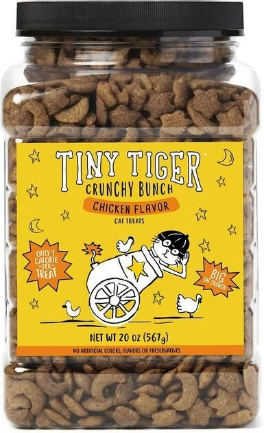 - Tiny Tiger Crunchy Bunch, Chicken Cannonball, Chicken Flavor Cat Treats pack a big crunch to scrub teeth and satisfy kitty’s cravings for crunchy snacks.