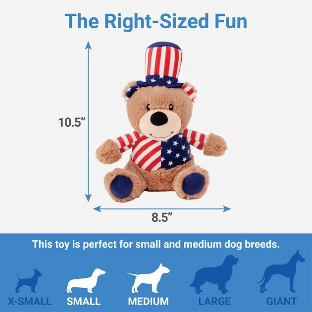 Toss, squeak, repeat—make playtime extra soft and noisy. It’s all about the bear necessities with this plush critter, like a built-in squeaker to turn up the excitement and ultra-soft plush fabric for cuddly softness. This bear is dressed to celebrate the 4th of July or any paw-triotic themed party. The touchable texture makes it a great nap buddy too.